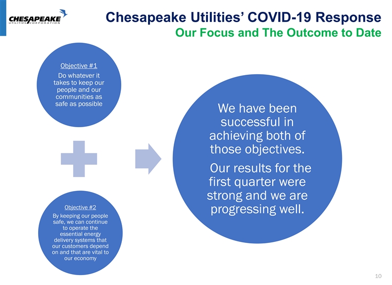 Total Shareholder Return Generating Solid Shareholder Returns Over the Long-Term Average Annualized Shareholder Return For Periods Ending April 30, 2020 25% 19% 20% 15% 15% 15% 13% 13% 12% 11% 11% 11% 11% 10% 9% 9% 9% 10% 9% 8% 7% 6% 6% 4% 5% 2% 1% 0% -5% -3% -7% -10% -8% 1 Year 3 Year 5 Year 10 Year 20 Year Peer Median Peer 75th Percentile CPK Dow Jones Util S&P 500 Compound Annual Shareholder Return For the periods ending April 30, 2020 Source: Bloomberg 1 Year 3 Year 5 Year 10 Year 20 Year Normal Comparative CPK -3.45% 8.06% 15.05% 18.78% 14.78% Peer Group Median* -8.02% 4.19% 10.40% 11.33% 10.99% 75th Percentile* -7.23% 6.09% 13.44% 13.22% 11.43% Dow Jones Util 1.61% 6.79% 9.44% 11.24% 8.52% S&P 500 0.85% 9.01% 9.10% 11.68% 5.52% 9Total Shareholder Return Generating Solid Shareholder Returns Over the Long-Term Average Annualized Shareholder Return For Periods Ending April 30, 2020 25% 19% 20% 15% 15% 15% 13% 13% 12% 11% 11% 11% 11% 10% 9% 9% 9% 10% 9% 8% 7% 6% 6% 4% 5% 2% 1% 0% -5% -3% -7% -10% -8% 1 Year 3 Year 5 Year 10 Year 20 Year Peer Median Peer 75th Percentile CPK Dow Jones Util S&P 500 Compound Annual Shareholder Return For the periods ending April 30, 2020 Source: Bloomberg 1 Year 3 Year 5 Year 10 Year 20 Year Normal Comparative CPK -3.45% 8.06% 15.05% 18.78% 14.78% Peer Group Median* -8.02% 4.19% 10.40% 11.33% 10.99% 75th Percentile* -7.23% 6.09% 13.44% 13.22% 11.43% Dow Jones Util 1.61% 6.79% 9.44% 11.24% 8.52% S&P 500 0.85% 9.01% 9.10% 11.68% 5.52% 9