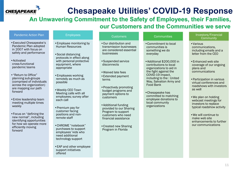 Chesapeake Utilities’ COVID-19 Response Our Focus and The Outcome to Date Objective #1 Do whatever it takes to keep our people and our communities as safe as possible We have been successful in achieving both of those objectives. Our results for the first quarter were strong and we are Objective #2 progressing well. By keeping our people safe, we can continue to operate the essential energy delivery systems that our customers depend on and that are vital to our economy 10Chesapeake Utilities’ COVID-19 Response Our Focus and The Outcome to Date Objective #1 Do whatever it takes to keep our people and our communities as safe as possible We have been successful in achieving both of those objectives. Our results for the first quarter were strong and we are Objective #2 progressing well. By keeping our people safe, we can continue to operate the essential energy delivery systems that our customers depend on and that are vital to our economy 10