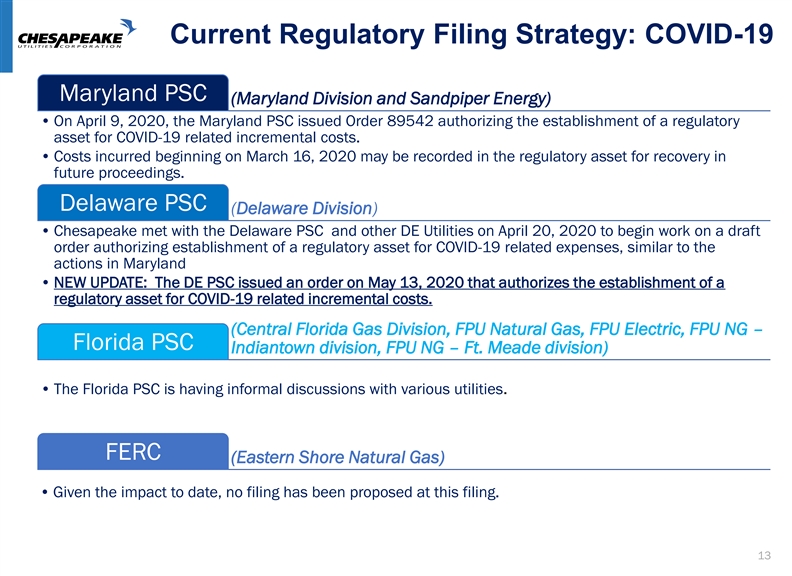 Key Business Factors: COVID–19 Impact •In March, lower margin of $400,000 was offset by lower costs of $400,000 •In April, lower C&I load has been partially offset with higher residential load driven by colder Margin weather in April •Employee/labor costs: COVID-19 related employee absences have not impacted operations; Paying premium (1.25x) for employees still reporting into offices and in the field to provide essential services •Bad debt expense: Continuing to monitor impact and will seek to manage through regulatory mechanisms, customer programs, the Sharing Program, and insurance Expenses •Reduce level of employee travel and offsite conferences for 2020 •Lower interest rates on short-term borrowing can partially offset pressures on C&I margin and essential employees’ pay premium •No disruptions experienced to date or expected in the future Supply Chain •CPK is not delaying it required pension funding for either the CPK or FPU’s pension plan until 2021 as allowed under the CARES Act Pension Plan •CPK has begun de-risking its pension plan and accordingly has moved the portfolio to more of a fixed income line-up •Work is progressing on growth expansion projects with no meaningful impacts or delays Capital experienced to date or expected Expenditures •No proposed change to our 2020 capital expenditure forecast of $185-$215 million. •Over $100 million of liquidity available under existing bilateral lines of credit ($220 million) and revolving credit facility ($150 million); $90 million new long-term debt July/August 2020 Liquidity •Secured additional $95 million of short-term debt capacity •$310 million Long-term Debt Shelf Facilities in place. 12Key Business Factors: COVID–19 Impact •In March, lower margin of $400,000 was offset by lower costs of $400,000 •In April, lower C&I load has been partially offset with higher residential load driven by colder Margin weather in April •Employee/labor costs: COVID-19 related employee absences have not impacted operations; Paying premium (1.25x) for employees still reporting into offices and in the field to provide essential services •Bad debt expense: Continuing to monitor impact and will seek to manage through regulatory mechanisms, customer programs, the Sharing Program, and insurance Expenses •Reduce level of employee travel and offsite conferences for 2020 •Lower interest rates on short-term borrowing can partially offset pressures on C&I margin and essential employees’ pay premium •No disruptions experienced to date or expected in the future Supply Chain •CPK is not delaying it required pension funding for either the CPK or FPU’s pension plan until 2021 as allowed under the CARES Act Pension Plan •CPK has begun de-risking its pension plan and accordingly has moved the portfolio to more of a fixed income line-up •Work is progressing on growth expansion projects with no meaningful impacts or delays Capital experienced to date or expected Expenditures •No proposed change to our 2020 capital expenditure forecast of $185-$215 million. •Over $100 million of liquidity available under existing bilateral lines of credit ($220 million) and revolving credit facility ($150 million); $90 million new long-term debt July/August 2020 Liquidity •Secured additional $95 million of short-term debt capacity •$310 million Long-term Debt Shelf Facilities in place. 12