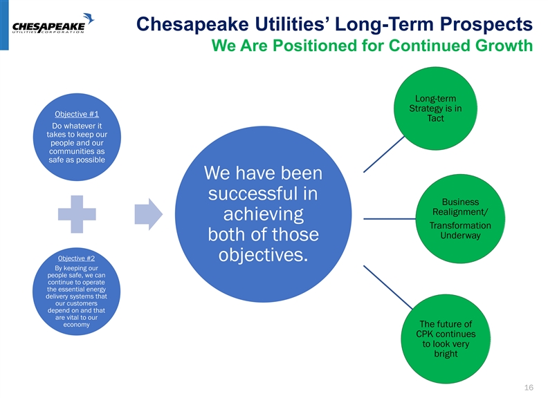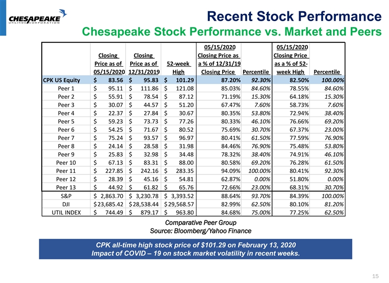 Recent Stock Performance Chesapeake Stock Performance vs. Market and Peers 05/15/2020 05/15/2020 Closing Closing Closing Price as Closing Price Price as of Price as of 52-week a % of 12/31/19 as a % of 52- 05/15/2020 12/31/2019 High Closing Price Percentile week High Percentile CPK US Equity $ 83.56 $ 95.83 $ 101.29 87.20% 92.30% 82.50% 100.00% Peer 1 $ 95 .11 $ 111.86 $ 121.08 85.03% 84.60% 78.55% 84.60% Peer 2 $ 55 .91 $ 78 .54 $ 87 .12 71.19% 15.30% 64.18% 15.30% Peer 3 $ 30 .07 $ 44 .57 $ 51 .20 67.47% 7.60% 58.73% 7.60% Peer 4 $ 22 .37 $ 27 .84 $ 30 .67 80.35% 53.80% 72.94% 38.40% Peer 5 $ 59 .23 $ 73 .73 $ 77 .26 80.33% 46.10% 76.66% 69.20% Peer 6 $ 54 .25 $ 71 .67 $ 80 .52 75.69% 30.70% 67.37% 23.00% Peer 7 $ 75 .24 $ 93 .57 $ 96 .97 80.41% 61.50% 77.59% 76.90% Peer 8 $ 24 .14 $ 28 .58 $ 31 .98 84.46% 76.90% 75.48% 53.80% Peer 9 $ 25 .83 $ 32 .98 $ 34 .48 78.32% 38.40% 74.91% 46.10% Peer 10 $ 67 .13 $ 83 .31 $ 88 .00 80.58% 69.20% 76.28% 61.50% Peer 11 $ 227.85 $ 242.16 $ 283.35 94.09% 100.00% 80.41% 92.30% Peer 12 $ 28 .39 $ 45 .16 $ 54 ..81 62.87% 0.00% 51.80% 0.00% Peer 13 $ 44 .92 $ 61 .82 $ 65 .76 72.66% 23.00% 68.31% 30.70% S&P $ 2,863.70 $ 3,230.78 $ 3,393.52 88.64% 93.70% 84.39% 100.00% DJI $23,685.42 $28,538.44 $29,568.57 82.99% 62.50% 80.10% 81.20% UTIL INDEX $ 744.49 $ 879.17 $ 963.80 84.68% 75.00% 77.25% 62.50% Comparative Peer Group Source: Bloomberg/Yahoo Finance CPK all-time high stock price of $101.29 on February 13, 2020 Impact of COVID – 19 on stock market volatility in recent weeks. 15Recent Stock Performance Chesapeake Stock Performance vs. Market and Peers 05/15/2020 05/15/2020 Closing Closing Closing Price as Closing Price Price as of Price as of 52-week a % of 12/31/19 as a % of 52- 05/15/2020 12/31/2019 High Closing Price Percentile week High Percentile CPK US Equity $ 83.56 $ 95.83 $ 101.29 87.20% 92.30% 82.50% 100.00% Peer 1 $ 95 .11 $ 111.86 $ 121.08 85.03% 84.60% 78.55% 84.60% Peer 2 $ 55 .91 $ 78 .54 $ 87 .12 71.19% 15.30% 64.18% 15.30% Peer 3 $ 30 .07 $ 44 .57 $ 51 .20 67.47% 7.60% 58.73% 7.60% Peer 4 $ 22 .37 $ 27 .84 $ 30 .67 80.35% 53.80% 72.94% 38.40% Peer 5 $ 59 .23 $ 73 .73 $ 77 .26 80.33% 46.10% 76.66% 69.20% Peer 6 $ 54 .25 $ 71 .67 $ 80 .52 75.69% 30.70% 67.37% 23.00% Peer 7 $ 75 .24 $ 93 .57 $ 96 .97 80.41% 61.50% 77.59% 76.90% Peer 8 $ 24 .14 $ 28 .58 $ 31 .98 84.46% 76.90% 75.48% 53.80% Peer 9 $ 25 .83 $ 32 .98 $ 34 .48 78.32% 38.40% 74.91% 46.10% Peer 10 $ 67 .13 $ 83 .31 $ 88 .00 80.58% 69.20% 76.28% 61.50% Peer 11 $ 227.85 $ 242.16 $ 283.35 94.09% 100.00% 80.41% 92.30% Peer 12 $ 28 .39 $ 45 .16 $ 54 .81 62.87% 0.00% 51.80% 0.00% Peer 13 $ 44 .92 $ 61 .82 $ 65 .76 72.66% 23.00% 68.31% 30.70% S&P $ 2,863.70 $ 3,230.78 $ 3,393.52 88.64% 93.70% 84.39% 100.00% DJI $23,685.42 $28,538.44 $29,568.57 82.99% 62.50% 80.10% 81.20% UTIL INDEX $ 744.49 $ 879.17 $ 963.80 84.68% 75.00% 77.25% 62.50% Comparative Peer Group Source: Bloomberg/Yahoo Finance CPK all-time high stock price of $101.29 on February 13, 2020 Impact of COVID – 19 on stock market volatility in recent weeks. 15