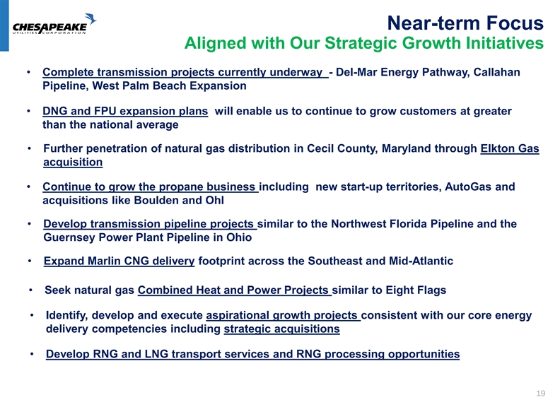 Looking Forward 2020 – 2022 Strategic Growth Initiatives Complete Develop new transmission transmission projects Earnings infrastructure projects Per Share Growth DNG and FPU gas organic Expand Marlin growth CNG delivery Total Return on Dividend Shareholder Equity Growth RNG and LNG Return Elkton Gas transport acquisition services and RNG processing Propane Disciplined business growth Capital Combined Heat via acquisitions, Investment and Power start-ups and Projects AutoGas 18Looking Forward 2020 – 2022 Strategic Growth Initiatives Complete Develop new transmission transmission projects Earnings infrastructure projects Per Share Growth DNG and FPU gas organic Expand Marlin growth CNG delivery Total Return on Dividend Shareholder Equity Growth RNG and LNG Return Elkton Gas transport acquisition services and RNG processing Propane Disciplined business growth Capital Combined Heat via acquisitions, Investment and Power start-ups and Projects AutoGas 18