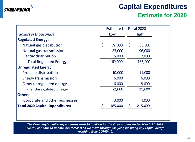 Capital Expenditures Estimate for 2020 Estimate for Fiscal 2020 (dollars in thousands) Low High Regulated Energy: Natural gas distribution $ 72,000 $ 83,000 Natural gas transmission 83,000 96,000 Electric distribution 5,000 7,000 Total Regulated Energy 160,000 186,000 Unregulated Energy: Propane distribution 10,000 11,000 Energy transmission 6,000 6,000 Other unregulated energy 6,000 8,000 Total Unregulated Energy 22,000 25,000 Other: Corporate and other businesses 3,000 4,000 Total 2020 Capital Expenditures $ 185,000 $ 215,000 The Company's capital expenditures were $41 million for the three months ended March 31, 2020. We will continue to update this forecast as we move through the year, including any capital delays resulting from COVID-19. 22Capital Expenditures Estimate for 2020 Estimate for Fiscal 2020 (dollars in thousands) Low High Regulated Energy: Natural gas distribution $ 72,000 $ 83,000 Natural gas transmission 83,000 96,000 Electric distribution 5,000 7,000 Total Regulated Energy 160,000 186,000 Unregulated Energy: Propane distribution 10,000 11,000 Energy transmission 6,000 6,000 Other unregulated energy 6,000 8,000 Total Unregulated Energy 22,000 25,000 Other: Corporate and other businesses 3,000 4,000 Total 2020 Capital Expenditures $ 185,000 $ 215,000 The Company's capital expenditures were $41 million for the three months ended March 31, 2020. We will continue to update this forecast as we move through the year, including any capital delays resulting from COVID-19. 22