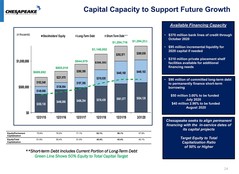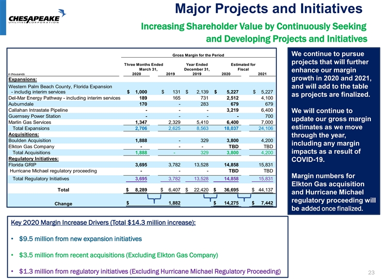 Major Projects and Initiatives Increasing Shareholder Value by Continuously Seeking and Developing Projects and Initiatives We continue to pursue Gross Margin for the Period projects that will further Three Months Ended Year Ended Estimated for March 31, December 31, Fiscal enhance our margin in thousands 2020 2019 2019 2020 2021 growth in 2020 and 2021, Expansions: Western Palm Beach County, Florida Expansion and will add to the table - includig interim services $ 1 ,000 $ 131 $ 2,139 $ 5,227 $ 5 ,227 as projects are finalized. Del-Mar Energy Pathway - including interim services 189 165 731 2,512 4 ,100 Auburndale 170 - 283 679 679 Callahan Intrastate Pipeline - - - 3,219 6,400 We will continue to Guernsey Power Station - - - - 700 update our gross margin Marlin Gas Services 1,347 2,329 5,410 6,400 7 ,000 estimates as we move Total Expansions 2 ,706 2,625 8 ,563 18,037 2 4,106 Acquisitions: through the year, Boulden Acquisition 1,888 - 329 3,800 4 ,200 including any margin Elkton Gas Company - - - TBD TBD impacts as a result of Total Acquisitions 1,888 - 329 3 ,800 4,200 Regulatory Initiatives: COVID-19. Florida GRIP 3,695 3 ,782 1 3,528 14,858 1 5,831 Hurricane Michael regulatory proceeding - - - TBD TBD Margin numbers for Total Regulatory Initiatives 3 ,695 3 ,782 13,528 14,858 1 5,831 Elkton Gas acquisition Total $ 8,289 $ 6,407 $ 22,420 $ 36,695 $ 4 4,137 and Hurricane Michael regulatory proceeding will $ 1,882 $ 14,275 $ 7,442 Change be added once finalized. Key 2020 Margin Increase Drivers (Total $14.3 million increase): • $9.5 million from new expansion initiatives • $3.5 million from recent acquisitions (Excluding Elkton Gas Company) • $1.3 million from regulatory initiatives (Excluding Hurricane Michael Regulatory Proceeding) 23Major Projects and Initiatives Increasing Shareholder Value by Continuously Seeking and Developing Projects and Initiatives We continue to pursue Gross Margin for the Period projects that will further Three Months Ended Year Ended Estimated for March 31, December 31, Fiscal enhance our margin in thousands 2020 2019 2019 2020 2021 growth in 2020 and 2021, Expansions: Western Palm Beach County, Florida Expansion and will add to the table - includig interim services $ 1 ,000 $ 131 $ 2,139 $ 5,227 $ 5 ,227 as projects are finalized. Del-Mar Energy Pathway - including interim services 189 165 731 2,512 4 ,100 Auburndale 170 - 283 679 679 Callahan Intrastate Pipeline - - - 3,219 6,400 We will continue to Guernsey Power Station - - - - 700 update our gross margin Marlin Gas Services 1,347 2,329 5,410 6,400 7 ,000 estimates as we move Total Expansions 2 ,706 2,625 8 ,563 18,037 2 4,106 Acquisitions: through the year, Boulden Acquisition 1,888 - 329 3,800 4 ,200 including any margin Elkton Gas Company - - - TBD TBD impacts as a result of Total Acquisitions 1,888 - 329 3 ,800 4,200 Regulatory Initiatives: COVID-19. Florida GRIP 3,695 3 ,782 1 3,528 14,858 1 5,831 Hurricane Michael regulatory proceeding - - - TBD TBD Margin numbers for Total Regulatory Initiatives 3 ,695 3 ,782 13,528 14,858 1 5,831 Elkton Gas acquisition Total $ 8,289 $ 6,407 $ 22,420 $ 36,695 $ 4 4,137 and Hurricane Michael regulatory proceeding will $ 1,882 $ 14,275 $ 7,442 Change be added once finalized. Key 2020 Margin Increase Drivers (Total $14.3 million increase): • $9.5 million from new expansion initiatives • $3.5 million from recent acquisitions (Excluding Elkton Gas Company) • $1.3 million from regulatory initiatives (Excluding Hurricane Michael Regulatory Proceeding) 23