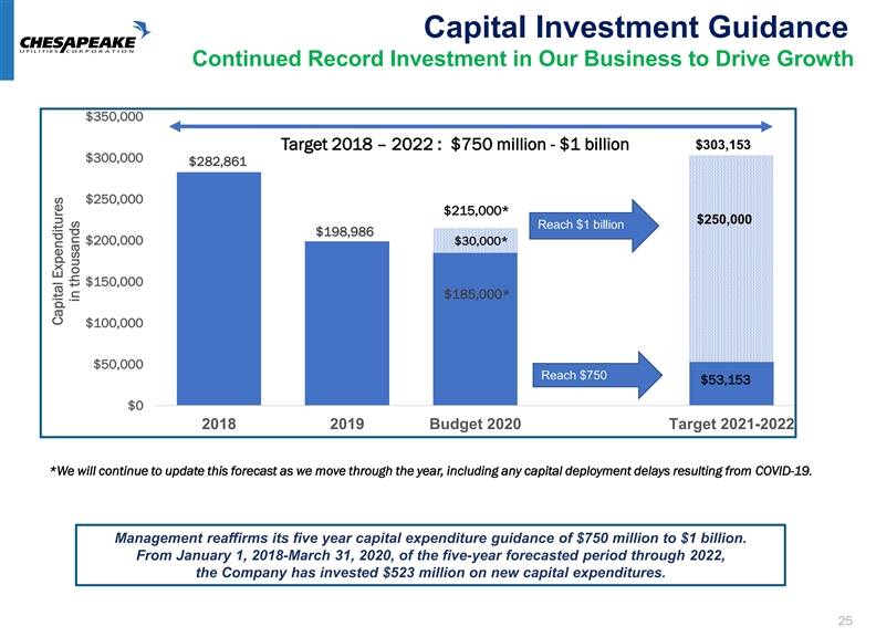 Capital Capacity to Support Future Growth Available Financing Capacity (in thousands) • $370 million bank lines of credit through Stockholders' Equity Long-Term Debt Short-Term Debt * * October 2020 $1,294,251 $1,294,716 • $95 million incremental liquidity for $1,140,852 2020 capital if needed $269,939 $292,971 • $310 million private placement shelf $944,079 $1,000,000 $306,393 facilities available for additional financing needs $805,010 $260,390 $440,183 $689,692 $440,168 $221,970 $316,020 • $90 million of committed long-term debt $182,548 $197,395 to permanently finance short-term $136,954 $500,000 borrowing $149,006 $50 million 3.00% to be funded $584,129 $561,577 July 2020 $518,439 $486,294 $446,086 $40 million 2.96% to be funded $358,138 August 2020 $0 12/31/15 12/31/16 12/31/17 12/31/18 12/31/19 3/31/20 Chesapeake seeks to align permanent financing with the in-service dates of its capital projects Equity/Permanent 70.6% 76.5% 71.1% 62.1% 56.1% 57.9% Capitalization Target Equity to Total Equity/Total 51.9% 55.4% 51.5% 45.4% 43.4% 45.1% Capitalization Capitalization Ratio of 50% or Higher **Short-term Debt Includes Current Portion of Long-Term Debt Green Line Shows 50% Equity to Total Capital Target 24Capital Capacity to Support Future Growth Available Financing Capacity (in thousands) • $370 million bank lines of credit through Stockholders' Equity Long-Term Debt Short-Term Debt * * October 2020 $1,294,251 $1,294,716 • $95 million incremental liquidity for $1,140,852 2020 capital if needed $269,939 $292,971 • $310 million private placement shelf $944,079 $1,000,000 $306,393 facilities available for additional financing needs $805,010 $260,390 $440,183 $689,692 $440,168 $221,970 $316,020 • $90 million of committed long-term debt $182,548 $197,395 to permanently finance short-term $136,954 $500,000 borrowing $149,006 $50 million 3.00% to be funded $584,129 $561,577 July 2020 $518,439 $486,294 $446,086 $40 million 2.96% to be funded $358,138 August 2020 $0 12/31/15 12/31/16 12/31/17 12/31/18 12/31/19 3/31/20 Chesapeake seeks to align permanent financing with the in-service dates of its capital projects Equity/Permanent 70.6% 76.5% 71.1% 62.1% 56.1% 57.9% Capitalization Target Equity to Total Equity/Total 51.9% 55.4% 51.5% 45.4% 43.4% 45.1% Capitalization Capitalization Ratio of 50% or Higher **Short-term Debt Includes Current Portion of Long-Term Debt Green Line Shows 50% Equity to Total Capital Target 24