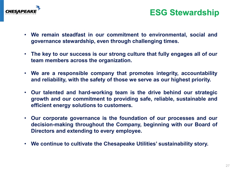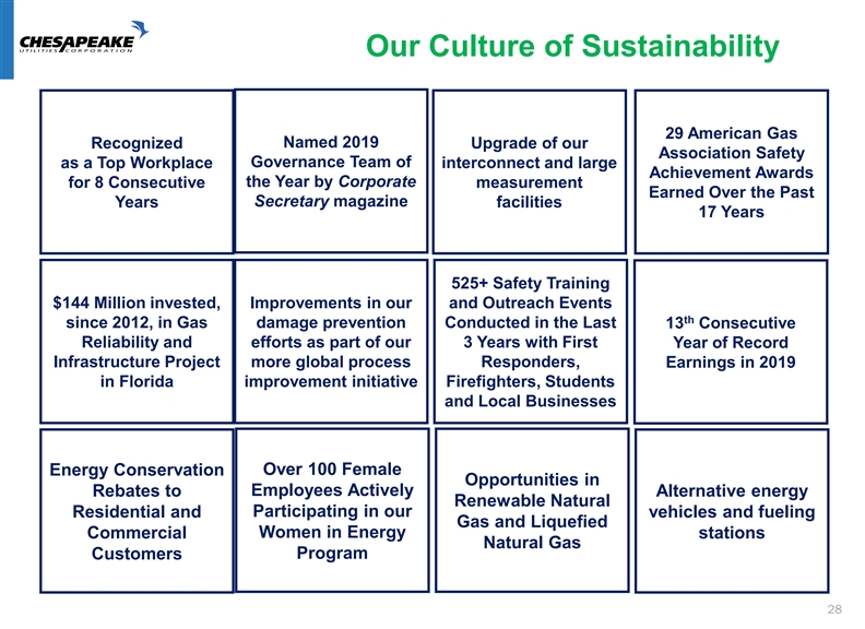ESG Stewardship • We remain steadfast in our commitment to environmental, social and governance stewardship, even through challenging times. • The key to our success is our strong culture that fully engages all of our team members across the organization. • We are a responsible company that promotes integrity, accountability and reliability, with the safety of those we serve as our highest priority. • Our talented and hard-working team is the drive behind our strategic growth and our commitment to providing safe, reliable, sustainable and efficient energy solutions to customers. • Our corporate governance is the foundation of our processes and our decision-making throughout the Company, beginning with our Board of Directors and extending to every employee. • We continue to cultivate the Chesapeake Utilities’ sustainability story. 27ESG Stewardship • We remain steadfast in our commitment to environmental, social and governance stewardship, even through challenging times. • The key to our success is our strong culture that fully engages all of our team members across the organization. • We are a responsible company that promotes integrity, accountability and reliability, with the safety of those we serve as our highest priority. • Our talented and hard-working team is the drive behind our strategic growth and our commitment to providing safe, reliable, sustainable and efficient energy solutions to customers. • Our corporate governance is the foundation of our processes and our decision-making throughout the Company, beginning with our Board of Directors and extending to every employee. • We continue to cultivate the Chesapeake Utilities’ sustainability story. 27