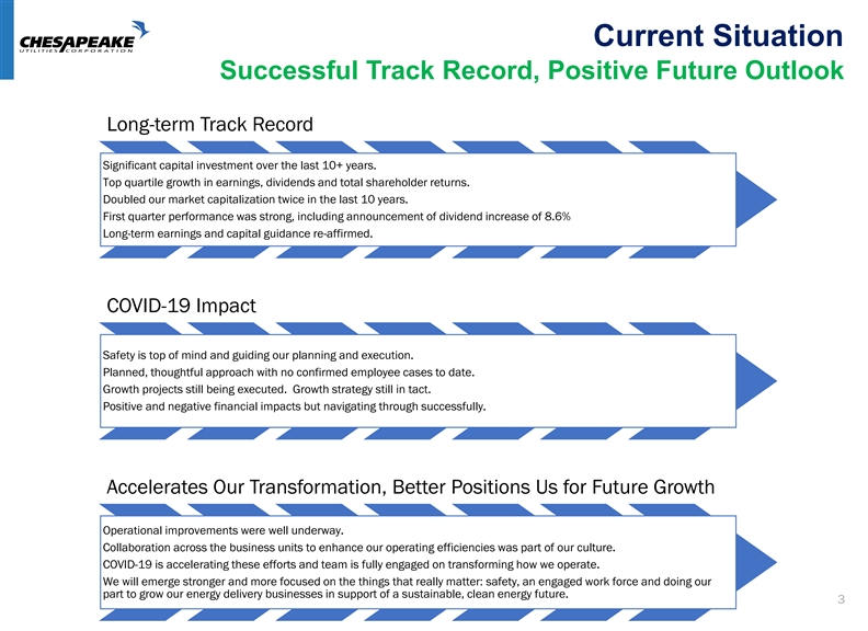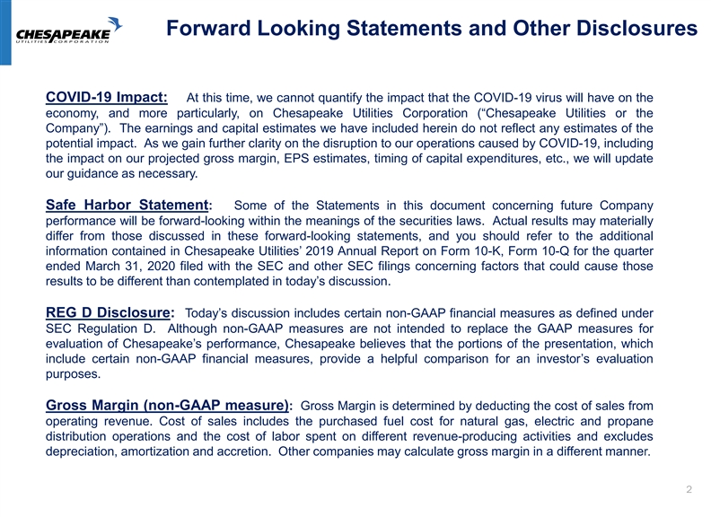 Forward Looking Statements and Other Disclosures COVID-19 Impact: At this time, we cannot quantify the impact that the COVID-19 virus will have on the economy, and more particularly, on Chesapeake Utilities Corporation(“Chesapeake Utilities or the Company”). The earnings and capital estimates we have included herein do not reflect any estimates of the potential impact. As we gain further clarity on the disruption to our operations caused by COVID-19, including the impact on our projected gross margin, EPS estimates, timing of capital expenditures, etc., we will update our guidance as necessary. Safe Harbor Statement: Some of the Statements in this document concerning future Company performance will be forward-looking within the meanings of the securities laws. Actual results may materially differ from those discussed in these forward-looking statements, and you should refer to the additional information contained in ChesapeakeUtilities’ 2019 Annual Report on Form 10-K, Form 10-Q for the quarter ended March 31, 2020 filed with the SEC and other SEC filings concerning factors that could cause those results to be different than contemplated intoday’s discussion. REG D Disclosure:Today’s discussion includes certain non-GAAP financial measures as defined under SEC Regulation D. Although non-GAAP measures are not intended to replace the GAAP measures for evaluation ofChesapeake’s performance, Chesapeake believes that the portions of the presentation, which include certain non-GAAP financial measures, provide a helpful comparison for aninvestor’s evaluation purposes. Gross Margin (non-GAAP measure): Gross Margin is determined by deducting the cost of sales from operating revenue. Cost of sales includes the purchased fuel cost for natural gas, electric and propane distribution operations and the cost of labor spent on different revenue-producing activities and excludes depreciation, amortization and accretion. Other companies may calculate gross margin in a different manner. 2Forward Looking Statements and Other Disclosures COVID-19 Impact: At this time, we cannot quantify the impact that the COVID-19 virus will have on the economy, and more particularly, on Chesapeake Utilities Corporation(“Chesapeake Utilities or the Company”). The earnings and capital estimates we have included herein do not reflect any estimates of the potential impact. As we gain further clarity on the disruption to our operations caused by COVID-19, including the impact on our projected gross margin, EPS estimates, timing of capital expenditures, etc., we will update our guidance as necessary. Safe Harbor Statement: Some of the Statements in this document concerning future Company performance will be forward-looking within the meanings of the securities laws. Actual results may materially differ from those discussed in these forward-looking statements, and you should refer to the additional information contained in ChesapeakeUtilities’ 2019 Annual Report on Form 10-K, Form 10-Q for the quarter ended March 31, 2020 filed with the SEC and other SEC filings concerning factors that could cause those results to be different than contemplated intoday’s discussion. REG D Disclosure:Today’s discussion includes certain non-GAAP financial measures as defined under SEC Regulation D. Although non-GAAP measures are not intended to replace the GAAP measures for evaluation ofChesapeake’s performance, Chesapeake believes that the portions of the presentation, which include certain non-GAAP financial measures, provide a helpful comparison for aninvestor’s evaluation purposes. Gross Margin (non-GAAP measure): Gross Margin is determined by deducting the cost of sales from operating revenue. Cost of sales includes the purchased fuel cost for natural gas, electric and propane distribution operations and the cost of labor spent on different revenue-producing activities and excludes depreciation, amortization and accretion. Other companies may calculate gross margin in a different manner. 2