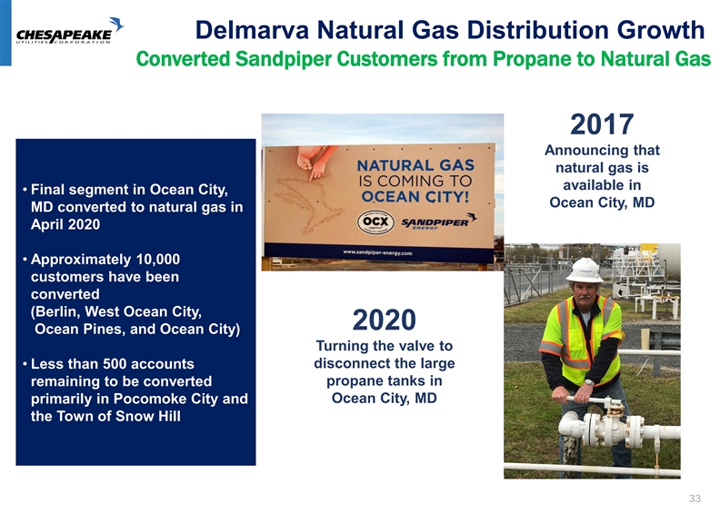 Delmarva Natural Gas Distribution Growth Converted Sandpiper Customers from Propane to Natural Gas 2017 Announcing that natural gas is available in • Final segment in Ocean City, Ocean City, MD MD converted to natural gas in April 2020 • Approximately 10,000 customers have been converted (Berlin, West Ocean City, 2020 Ocean Pines, and Ocean City) Turning the valve to disconnect the large • Less than 500 accounts remaining to be converted propane tanks in Ocean City, MD primarily in Pocomoke City and the Town of Snow Hill 33Delmarva Natural Gas Distribution Growth Converted Sandpiper Customers from Propane to Natural Gas 2017 Announcing that natural gas is available in • Final segment in Ocean City, Ocean City, MD MD converted to natural gas in April 2020 • Approximately 10,000 customers have been converted (Berlin, West Ocean City, 2020 Ocean Pines, and Ocean City) Turning the valve to disconnect the large • Less than 500 accounts remaining to be converted propane tanks in Ocean City, MD primarily in Pocomoke City and the Town of Snow Hill 33