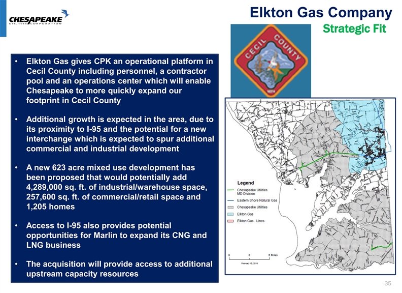 Natural Gas Distribution Growth Acquisition of Propane Distribution Systems • Application was filed with the Delaware PSC seeking approval for regulatory accounting treatment and valuation methodology for the acquisition of propane CGS owned by our affiliate, Sharp, and the conversion of the CGS to natural gas service • Specifics of the application included: • Acquire each CGS one at a time and to pay replacement cost for each CGS system • Authorization to pay for and capitalize the CGS residents’ behind-the-meter conversion costs • The involved parties have reached a settlement agreement on the application. PSC approval of the settlement agreement is expected to occur in the second quarter 34Natural Gas Distribution Growth Acquisition of Propane Distribution Systems • Application was filed with the Delaware PSC seeking approval for regulatory accounting treatment and valuation methodology for the acquisition of propane CGS owned by our affiliate, Sharp, and the conversion of the CGS to natural gas service • Specifics of the application included: • Acquire each CGS one at a time and to pay replacement cost for each CGS system • Authorization to pay for and capitalize the CGS residents’ behind-the-meter conversion costs • The involved parties have reached a settlement agreement on the application. PSC approval of the settlement agreement is expected to occur in the second quarter 34