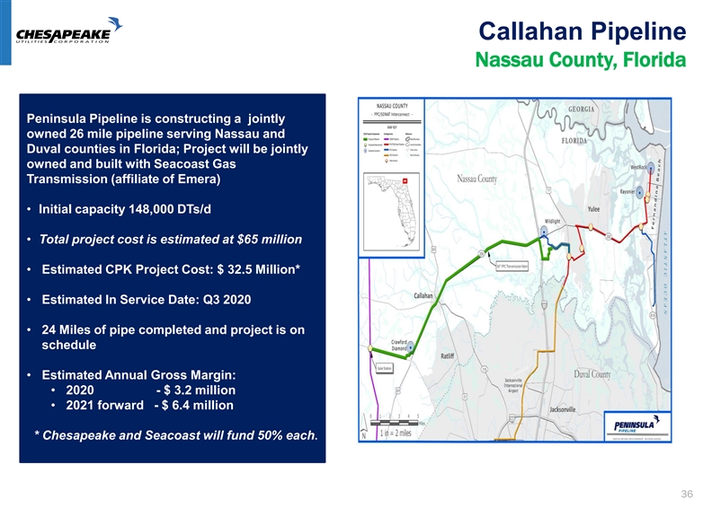Callahan Pipeline Nassau County, Florida Peninsula Pipeline is constructing a jointly owned 26 mile pipeline serving Nassau and Duval counties in Florida; Project will be jointly owned and built with Seacoast Gas Transmission (affiliate of Emera) • Initial capacity 148,000 DTs/d • Total project cost is estimated at $65 million • Estimated CPK Project Cost: $ 32.5 Million* • Estimated In Service Date: Q3 2020 • 24 Miles of pipe completed and project is on schedule • Estimated Annual Gross Margin: • 2020 - $ 3.2 million • 2021 forward - $ 6.4 million * Chesapeake and Seacoast will fund 50% each. 36Callahan Pipeline Nassau County, Florida Peninsula Pipeline is constructing a jointly owned 26 mile pipeline serving Nassau and Duval counties in Florida; Project will be jointly owned and built with Seacoast Gas Transmission (affiliate of Emera) • Initial capacity 148,000 DTs/d • Total project cost is estimated at $65 million • Estimated CPK Project Cost: $ 32.5 Million* • Estimated In Service Date: Q3 2020 • 24 Miles of pipe completed and project is on schedule • Estimated Annual Gross Margin: • 2020 - $ 3.2 million • 2021 forward - $ 6.4 million * Chesapeake and Seacoast will fund 50% each. 36