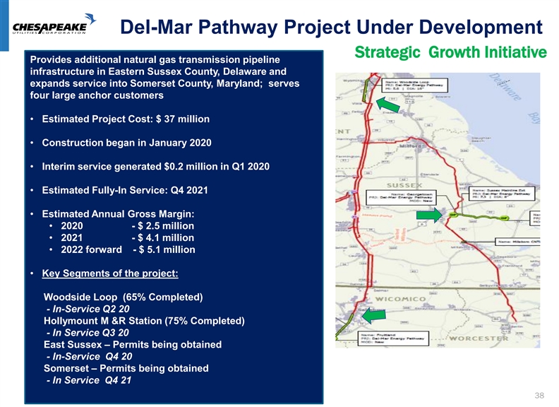 West Palm Beach County, Florida Expansion Enhances Reliability and Provides Additional Customer Growth • $33 million capital investment • $1.0 million margin in Q1 2020 • $5.2 million margin in 2020 and beyond • Fully in-service Q3 2020 • Pipeline construction 80% complete • Four PPC projects to serve FPU’s natural gas distribution systems expansions in Palm Beach County. • Resolves a pipeline capacity constraint. 37West Palm Beach County, Florida Expansion Enhances Reliability and Provides Additional Customer Growth • $33 million capital investment • $1.0 million margin in Q1 2020 • $5.2 million margin in 2020 and beyond • Fully in-service Q3 2020 • Pipeline construction 80% complete • Four PPC projects to serve FPU’s natural gas distribution systems expansions in Palm Beach County. • Resolves a pipeline capacity constraint. 37