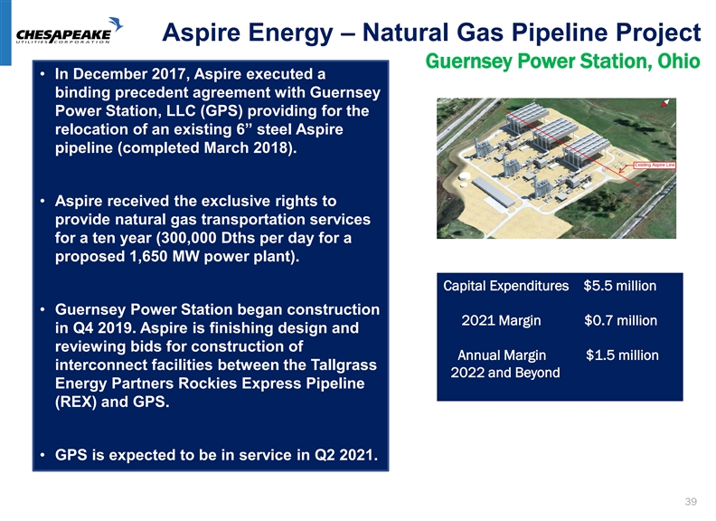 Del-Mar Pathway Project Under Development Strategic Growth Initiative Provides additional natural gas transmission pipeline infrastructure in Eastern Sussex County, Delaware and expands service into Somerset County, Maryland; serves four large anchor customers • Estimated Project Cost: $ 37 million • Construction began in January 2020 • Interim service generated $0.2 million in Q1 2020 • Estimated Fully-In Service: Q4 2021 • Estimated Annual Gross Margin: • 2020 - $ 2.5 million • 2021 - $ 4.1 million • 2022 forward - $ 5.1 million • Key Segments of the project: Woodside Loop (65% Completed) - In-Service Q2 20 Hollymount M &R Station (75% Completed) - In Service Q3 20 East Sussex – Permits being obtained - In-Service Q4 20 Somerset – Permits being obtained - In Service Q4 21 38Del-Mar Pathway Project Under Development Strategic Growth Initiative Provides additional natural gas transmission pipeline infrastructure in Eastern Sussex County, Delaware and expands service into Somerset County, Maryland; serves four large anchor customers • Estimated Project Cost: $ 37 million • Construction began in January 2020 • Interim service generated $0.2 million in Q1 2020 • Estimated Fully-In Service: Q4 2021 • Estimated Annual Gross Margin: • 2020 - $ 2.5 million • 2021 - $ 4.1 million • 2022 forward - $ 5.1 million • Key Segments of the project: Woodside Loop (65% Completed) - In-Service Q2 20 Hollymount M &R Station (75% Completed) - In Service Q3 20 East Sussex – Permits being obtained - In-Service Q4 20 Somerset – Permits being obtained - In Service Q4 21 38