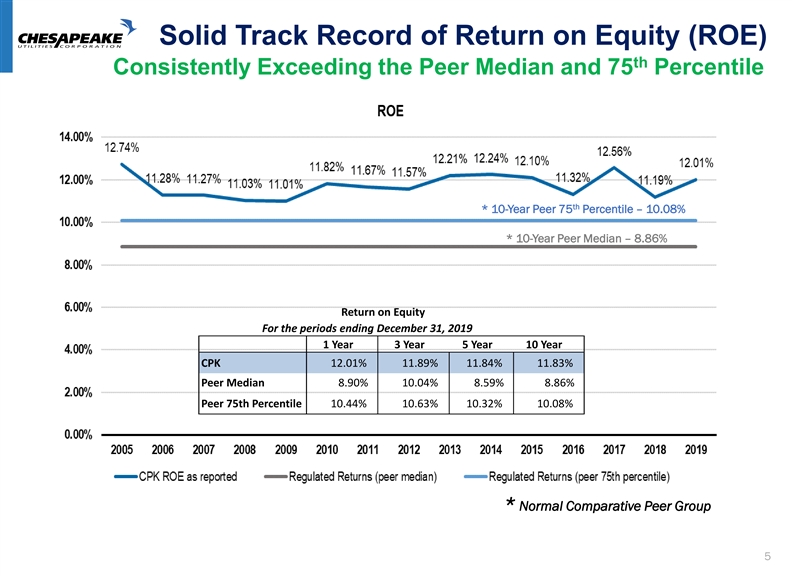 Business Overview Diversified Energy Delivery Business Natural Gas Distribution Delaware, Maryland, Florida Natural Gas Transmission Delaware, Maryland, Pennsylvania, Florida 81% Electric Distribution Florida Propane Distribution and AutoGas Delaware, Maryland, Pennsylvania, Virginia, Florida Marlin Mobile CNG Temporary Services and Combined Heat & Power 19% Eastern United States Natural Gas Transportation Ohio Operating Income from Continuing Operations For the Year Ended December 31, (in thousands) 2019 2018 2017 2016 2015 Regulated Energy $ 86,584 $ 79,215 $ 74,584 $ 71,515 $ 62,137 Unregulated Energy 1 9,939 1 7,124 14,941 11,732 14,244 Other businesses and eliminations (236) (1,496) 205 402 418 Total Operating Income from 4 Continuing Operations $ 106,287 $ 94,843 $ 89,730 $ 83,649 $ 76,799 Unregulated Energy Regulated EnergyBusiness Overview Diversified Energy Delivery Business Natural Gas Distribution Delaware, Maryland, Florida Natural Gas Transmission Delaware, Maryland, Pennsylvania, Florida 81% Electric Distribution Florida Propane Distribution and AutoGas Delaware, Maryland, Pennsylvania, Virginia, Florida Marlin Mobile CNG Temporary Services and Combined Heat & Power 19% Eastern United States Natural Gas Transportation Ohio Operating Income from Continuing Operations For the Year Ended December 31, (in thousands) 2019 2018 2017 2016 2015 Regulated Energy $ 86,584 $ 79,215 $ 74,584 $ 71,515 $ 62,137 Unregulated Energy 1 9,939 1 7,124 14,941 11,732 14,244 Other businesses and eliminations (236) (1,496) 205 402 418 Total Operating Income from 4 Continuing Operations $ 106,287 $ 94,843 $ 89,730 $ 83,649 $ 76,799 Unregulated Energy Regulated Energy
