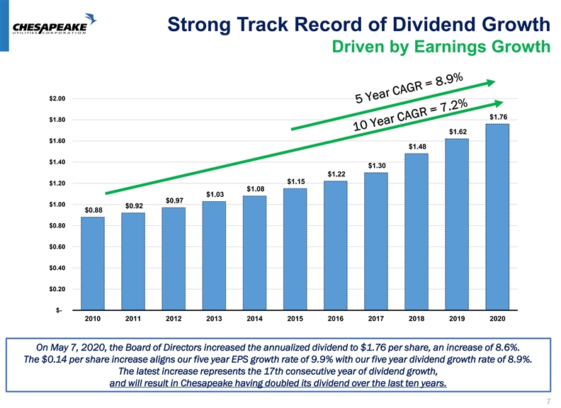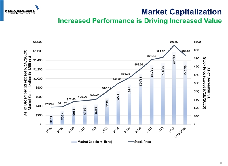 Strong Track Record of Dividend Growth Driven by Earnings Growth $2.00 $1.76 $1.80 $1.62 $1.60 $1.48 $1.40 $1.30 $1.22 $1.15 $1.20 $1.08 $1.03 $0.97 $1.00 $0.92 $0.88 $0.80 $0.60 $0.40 $0.20 $- 2010 2011 2012 2013 2014 2015 2016 2017 2018 2019 2020 On May 7, 2020, the Board of Directors increased the annualized dividend to $1.76 per share, an increase of 8.6%. The $0.14 per share increase aligns our five year EPS growth rate of 9.9% with our five year dividend growth rate of 8.9%. The latest increase represents the 17th consecutive year of dividend growth, and will result in Chesapeake having doubled its dividend over the last ten years. 7Strong Track Record of Dividend Growth Driven by Earnings Growth $2.00 $1.76 $1.80 $1.62 $1.60 $1.48 $1.40 $1.30 $1.22 $1.15 $1.20 $1.08 $1.03 $0.97 $1.00 $0.92 $0.88 $0.80 $0.60 $0.40 $0.20 $- 2010 2011 2012 2013 2014 2015 2016 2017 2018 2019 2020 On May 7, 2020, the Board of Directors increased the annualized dividend to $1.76 per share, an increase of 8.6%. The $0.14 per share increase aligns our five year EPS growth rate of 9.9% with our five year dividend growth rate of 8.9%. The latest increase represents the 17th consecutive year of dividend growth, and will result in Chesapeake having doubled its dividend over the last ten years. 7